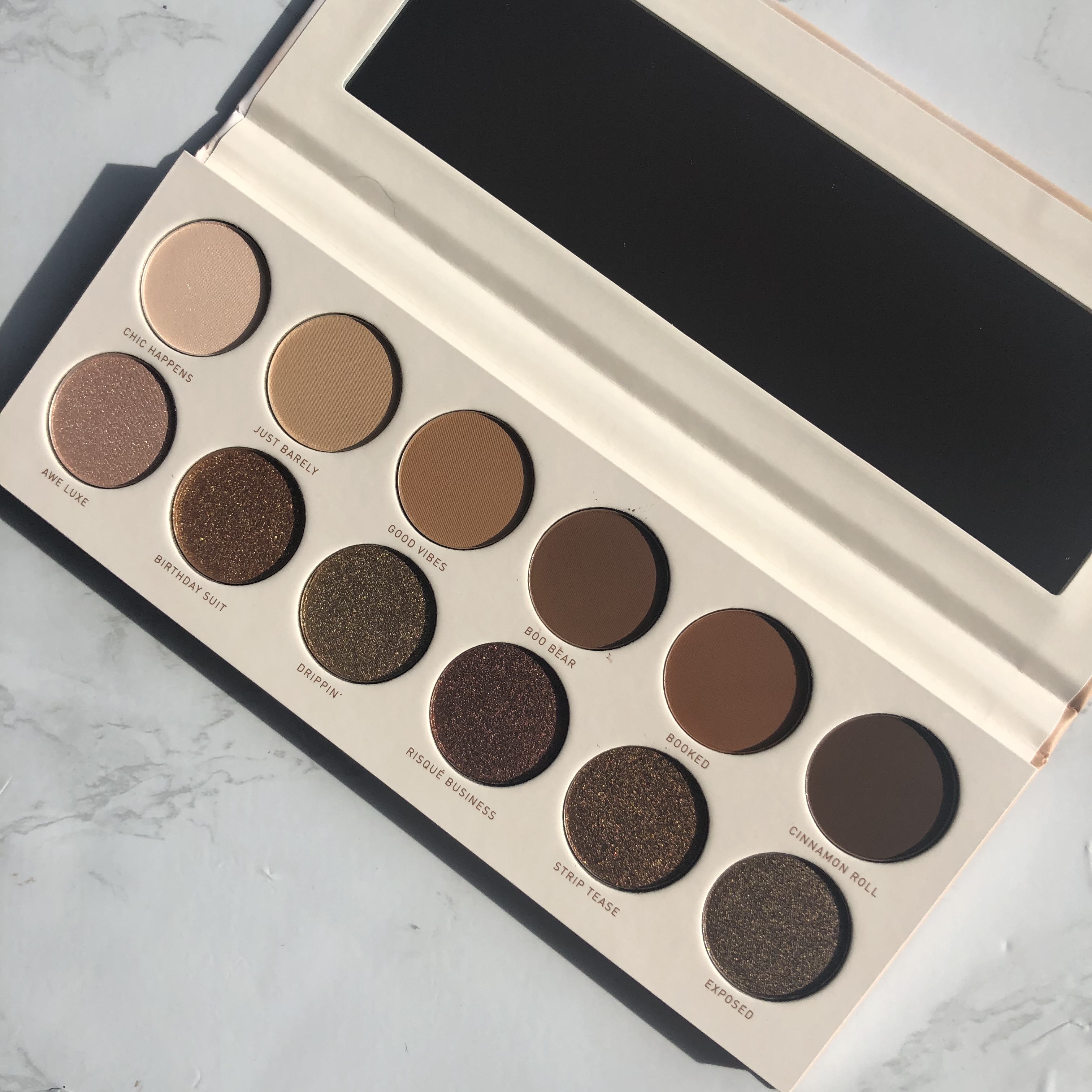 I find the shimmers to be a bit finicky. With my Jaclyn Hill Vol 1 palette, the shimmers can be packed on using a finger or a dense brush AND can be blended out softly with a fluffy brush. I often like using a fluffy brush with shimmers during the day to create a softer look. I find that the shimmers in this Divine Neutral palette look great packed on but barely show up on the lid when I try to do a soft look. I’m a bit disappointed because it feels to me that they changed the formula.